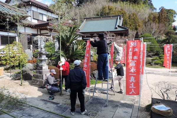 元日の午前0時からは本堂で新春祈祷会を執り行い、新春をお祝いし世界の平和と皆様の所願成就を祈り、日蓮宗大荒行成満僧が木剣加持祈祷を行います。